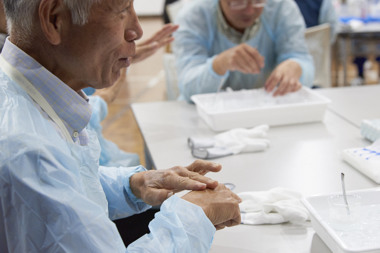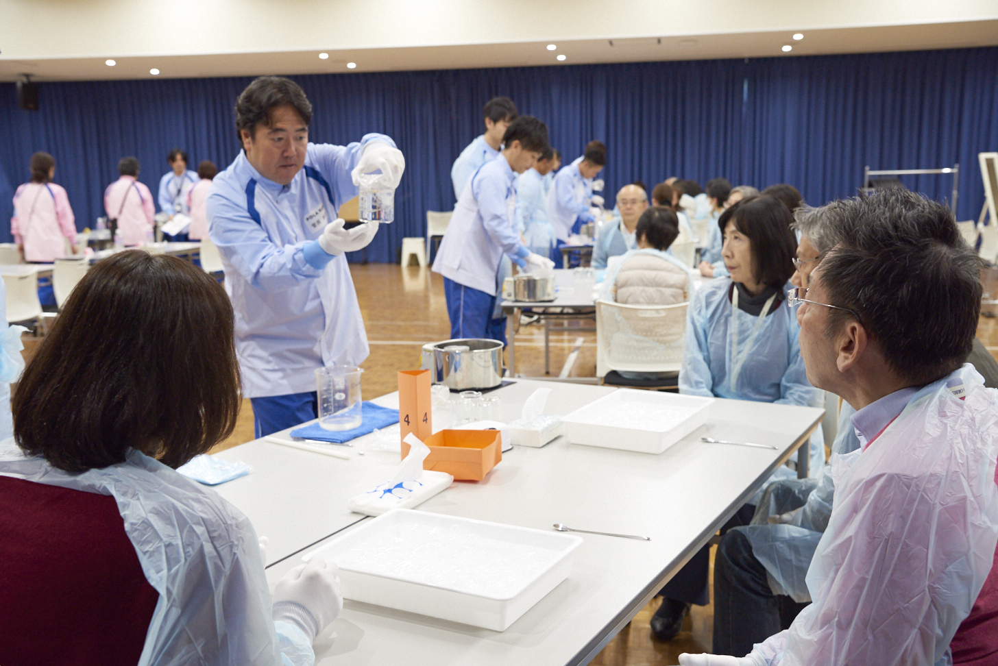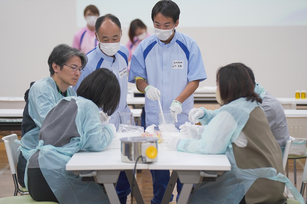 作業着を着用して工場棟をご見学いただいた後、「クリームづくり体験」では乳化の工程を研究員と共にご体験いただきました。当社グループの技術とこだわりを凝縮して作られた様々なクリームをお試しいただき、ご参加者さまから大変ご好評をいただきました。